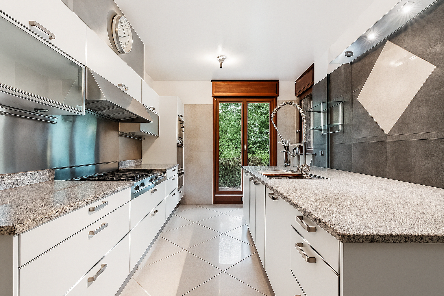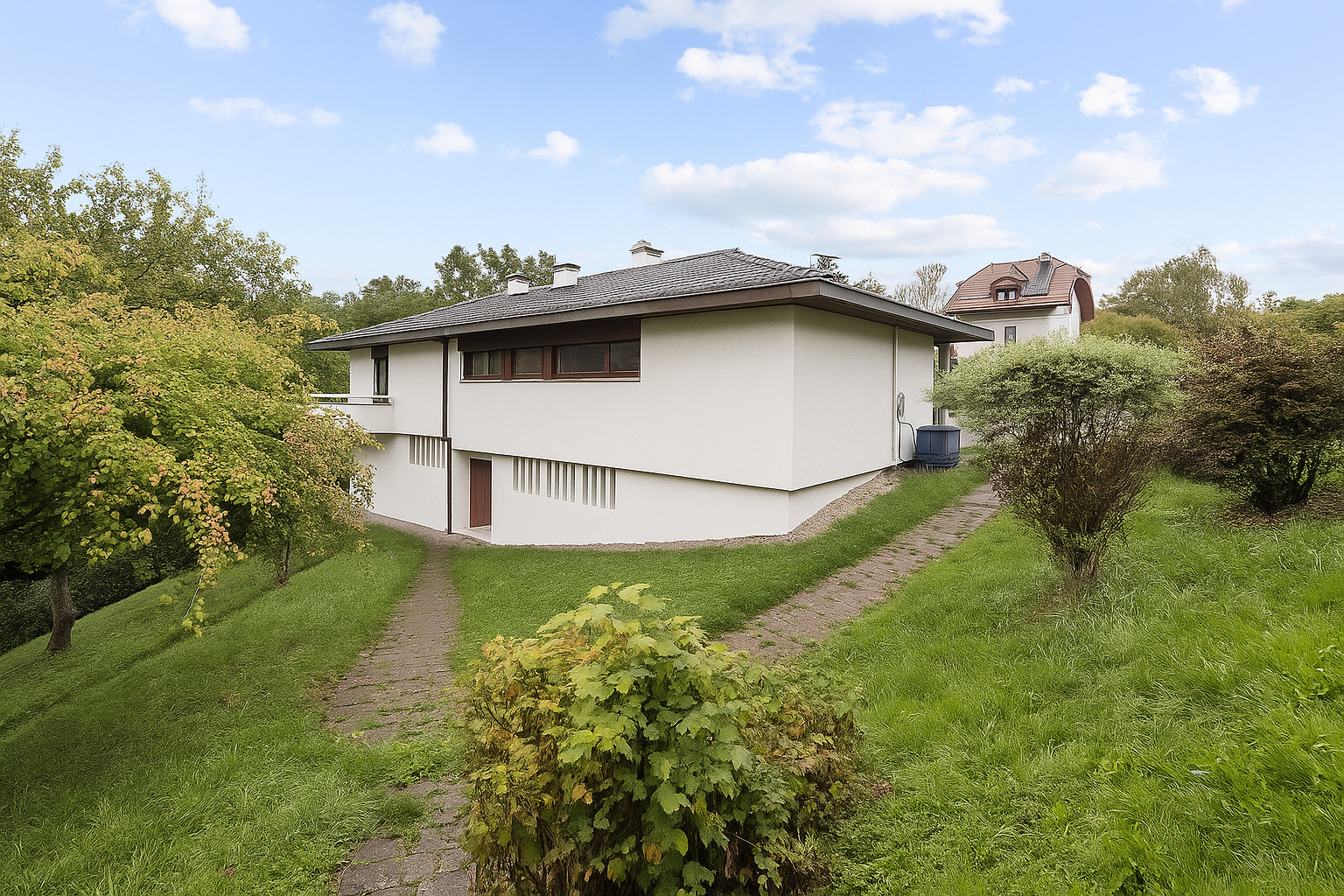 Édifiée sur une vaste parcelle arborée, dont une partie boisée qui procure une impression unique d’être coupé du monde, la villa bénéficie de grandes terrasses à chaque niveau, de panneaux solaires, d’un double garage et d’une grande cour intérieure.